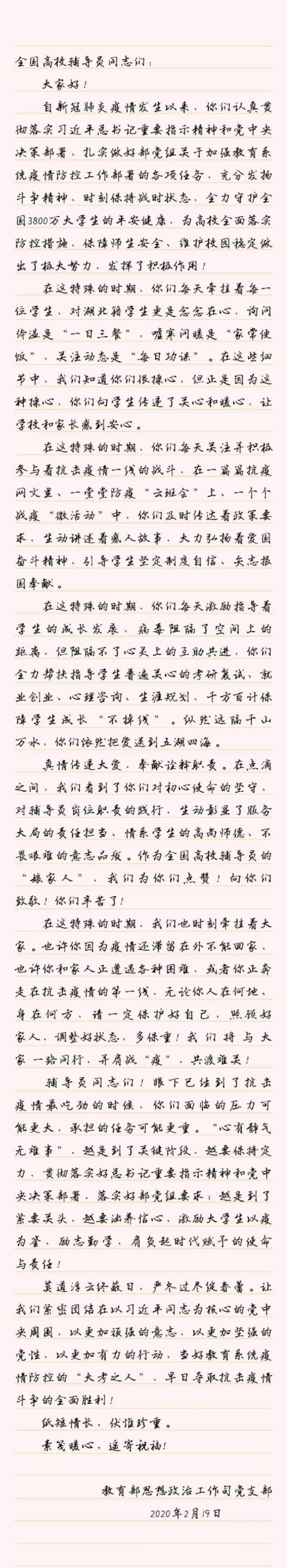 2020年伊始,新型冠状病毒肆虐而来,一场没有硝烟的战争打响了,正值新冠肺炎疫情防控攻坚的关键时期,教育部思想政治工作司党支部以《共克时艰 勠力同行》为题给全国高校辅导员致信,勉励全国高校辅导员以更强的意志、党性和行动做好教育系统疫情防控的工作,早日夺取抗击疫情斗争的全面胜利。