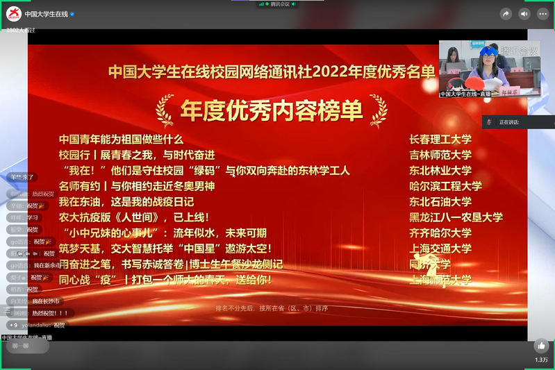 其间,会议揭晓了中国大学生在线2022年度校网通站表彰名单,其中我院出品的“农大抗疫版‘人世间’,已上线!”荣获“年度优秀内容榜单”荣誉称号。