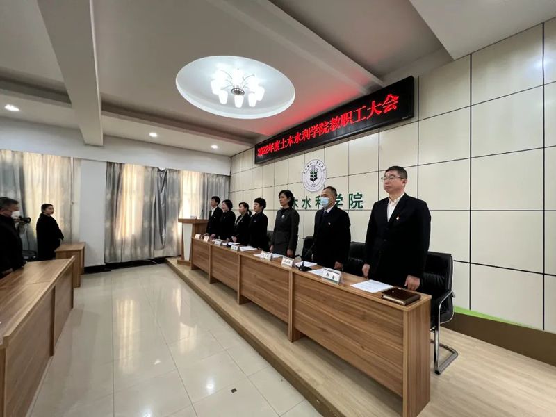 在雄壮的国歌声中学院教职工大会开拉开帷幕。大会主题是:高举习近平新时代中国特色社会主义思想伟大旗帜,持续深入学习宣传贯彻党的二十大精神和黑龙江省第十三次党代会精神,切实把“两个确立”转化为“两个维护”的高度自觉,坚守为党育人、为国育才宗旨,坚定信心,狠抓机遇,凝聚全院教工智慧和力量,推进落实学院“十四五”规划目标,全面完成“三育人”改革发展任务,促进学院教科研、人才培养、社会服务、党建思政工作提质增效,为推动学院高质量发展而团结奋斗!
