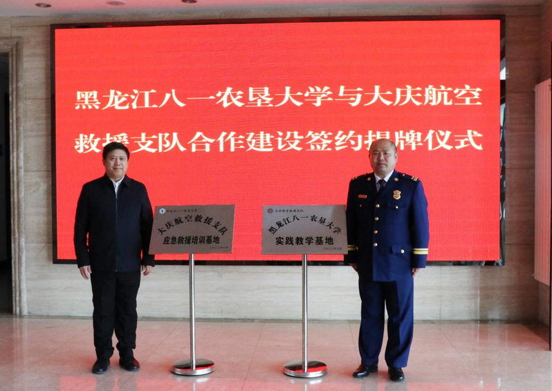 校长郑喜群与国家消防救援局大庆航空救援支队支队长王兴坤共同为基地揭牌。
