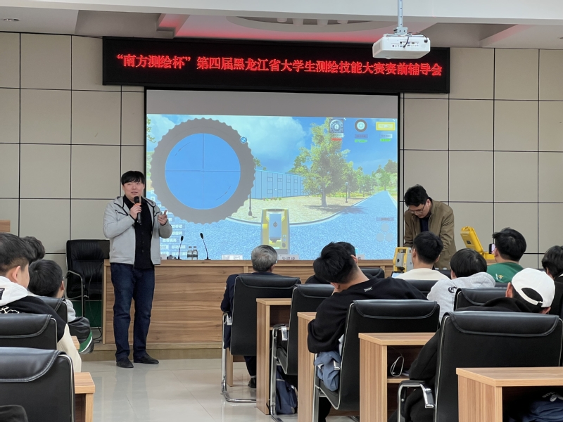 会上,郑鑫副院长首先对朱总经理一行到访我院,为师生培训表示热烈的欢迎以及衷心的感谢,并表示学院会高度重视此次比赛,积极为参赛学生提供帮助。接下来,朱洪成总经理向参会师生介绍南方测绘公司的发展历程,以及黑龙江省大学生测绘技能大赛的发展沿革;副总经理郭嵩、部门总监张红星现场为大家演示了虚拟仿真数字测图、RTK数字化测图、虚拟仿真无人机航测三个比赛项目,以及仪器的使用,强调了比赛实操过程中的注意事项;最后,付开隆教授作了专题分享,并介绍了指导学生参加省赛、国赛的经验,也为参赛同学也提出了建议。