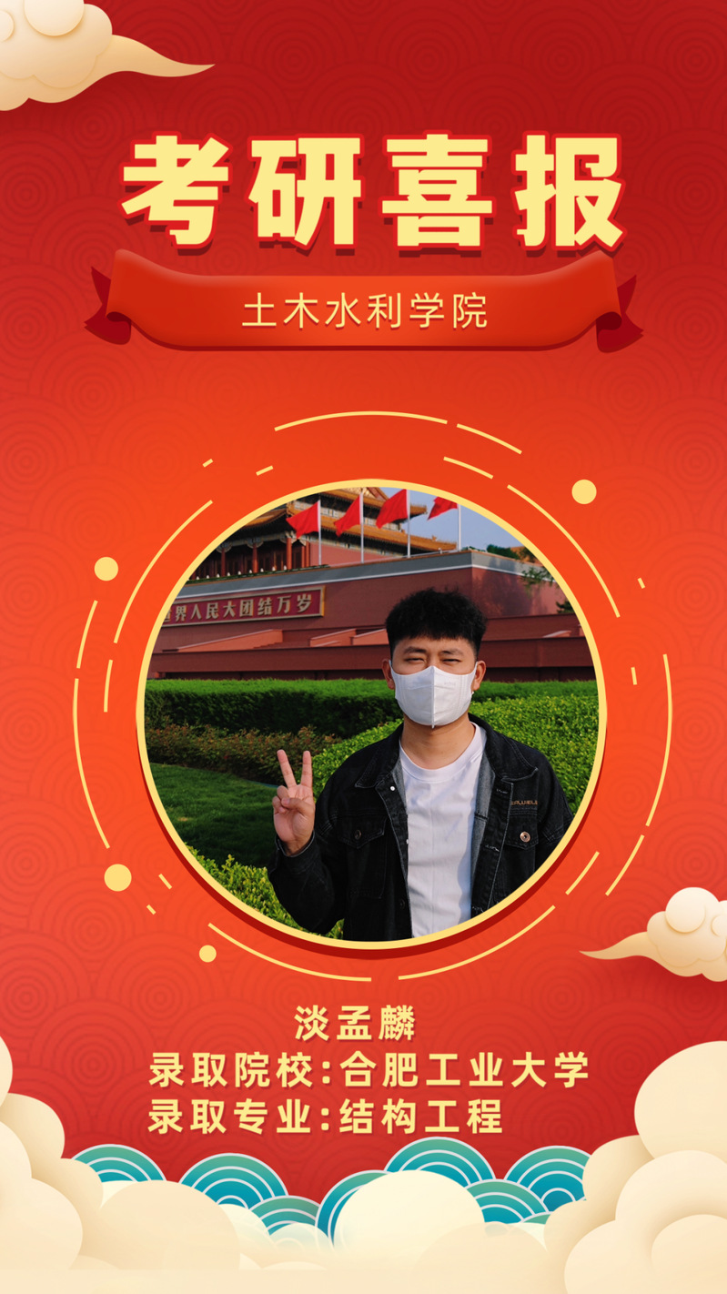 淡孟麟,男,中共党员,四川射洪人,我院2019级土木工程专业学生,担任班级学习委员职务。曾获“全国大学生三维数字化创新设计大赛”一等奖、“2022‘鲁班杯’全国大学生BIM作品设计大赛”一等奖、“2022年全国大学生测绘学科创新创业智能大赛”二等奖、“第四届绿色建筑设计技能大赛”三等奖、“第九届‘龙建杯’大学生创新创业大赛” 三等奖等省级以上奖励20余项,获得“王震奖励基金‘尚学奖’”、“一等综合奖学金”等荣誉奖励10余项。参与省级大学生创新创业训练项目1项,发表学术论文2篇,获批国家专利、软件著作权等3项。获得多所“双一流”高校的拟录取offer,现已保送至合肥工业大学攻读研究生。