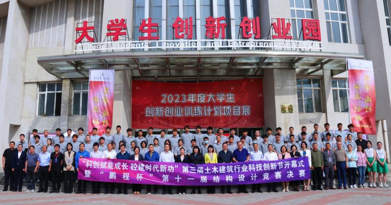学校领导、嘉宾与师生代表共同为“科创赋能成长 砼建时代新功”第三届土木建筑行业科技创新节暨第十一届“鹏程杯”大学生结构设计大赛开幕式启幕。