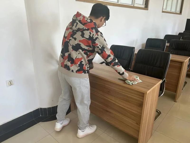 活动中,同学们带着清扫所需工具在学院大厅集合,在进行简单分工后同学们有序的进入学院会议室进行卫生打扫。在打扫过程中同学们十分专注,用抹布和扫把细致打扫,不放过一个角落,将门窗、桌椅、讲台等打扫的焕然一新。