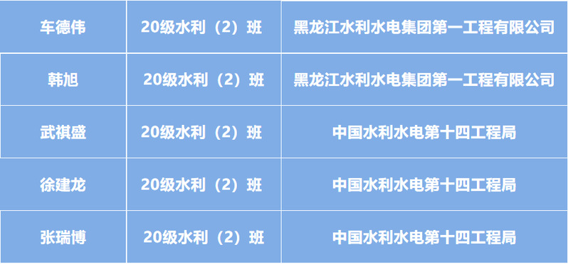 武祺盛,20级水利(2)班,群众,曾获四等综合奖学金,已与中国水利水电第十四工程局签约。