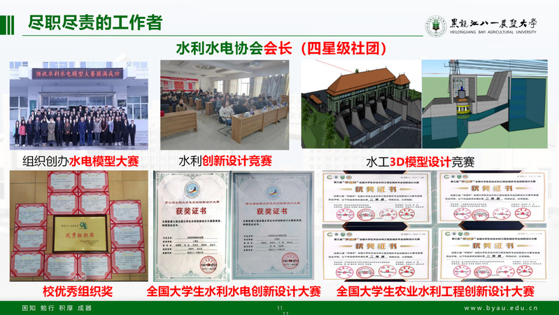 作为水利水电协会会长,他组织创办水利水电模型制作大赛,水利创新云竞赛等多项赛事,协会代表作品在全国大学生农业水利工程创新设计大赛,全国大学生水利水电创新设计大赛中获奖。目前协会被评选为学校四星级社团,本人获学生社团先进个人。