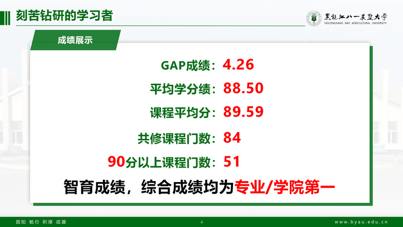 入校以来他始终把学习作为自己的第一要务,智育成绩和综合成绩均为专业第一。截至目前共修课程85门,90分以上课程为51门,课程平均分为89.59,平均学分绩为88.5,绩点为4.26。