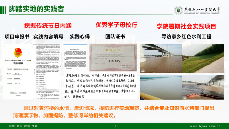 纸上得来终觉浅,在寒暑假期间,他积极参与到三下乡社会实践活动。在学院特色实践项目“寻访家乡红色水利工程”中,他对家乡黄河桥的水情,岸边情况,堤防进行实地观察,并结合专业知识向水利部门提出清理漂浮物,加固堤防,整修河岸的相关建议。