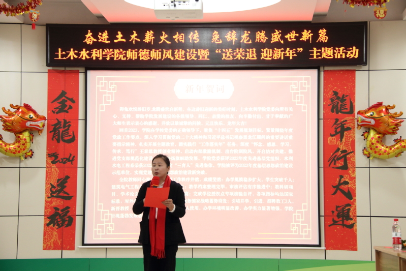 12月29日金沙集团1862cc成色于310会议室举办“奋进土木薪火相传 兔辞龙腾盛世新篇”金沙集团1862cc成色师德师风建设暨“迎新年 送荣退”主题活动,学院领导班子、全体教师参会,活动邀请金沙集团1862cc成色首任领导班子成员、现任经济管理学院党委副书记赵玥,校友代表1990级建筑工程专业毕业生、牡丹江市建科工程技术咨询有限公司董事长胡韬、总经理徐敬清受邀参加。
