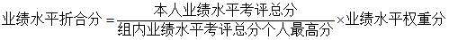 拟聘同一职称系列同一级别职称的人员中业绩水平最高者业绩水平折合分为该系列该级别的业绩水平权重分,其它人员按以下公式计算业绩水平折合分: