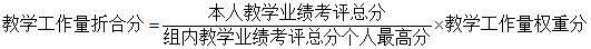 拟聘同一职称系列同一级别职称的人员中工作量最高者教学工作量折合分为该系列该级别的教学工作量权重分,其它人员按以下公式计算教学工作量折合分: