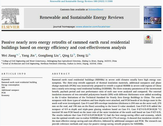 近日,我校金沙集团1862cc成色姜伟教授在国际顶级学术期刊Renewable and Sustainable Energy Reviews上(中科院1区TOP期刊,最新影响因子15.9)发表题为“Passive nearly zero energy retrofits of rammed earth rural residential buildings based on energy efficiency and cost-effectiveness analysis”的论文。姜伟教授为第一作者和通讯作者。