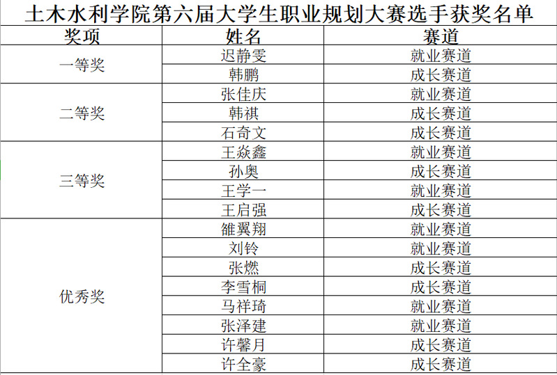 经过激烈的角逐,大赛分别评选出成长赛道一等奖1名,二等奖2名,三等奖2名;就业赛道一等奖1名,二等奖1名,三等奖2名参加校大学生职业规划大赛。不仅为学生们提供了一个展示自我、锻炼能力的平台,而且提高了大学生的职业规划意识,增强了就业竞争力,达到了以赛促教、以赛促训的目的。