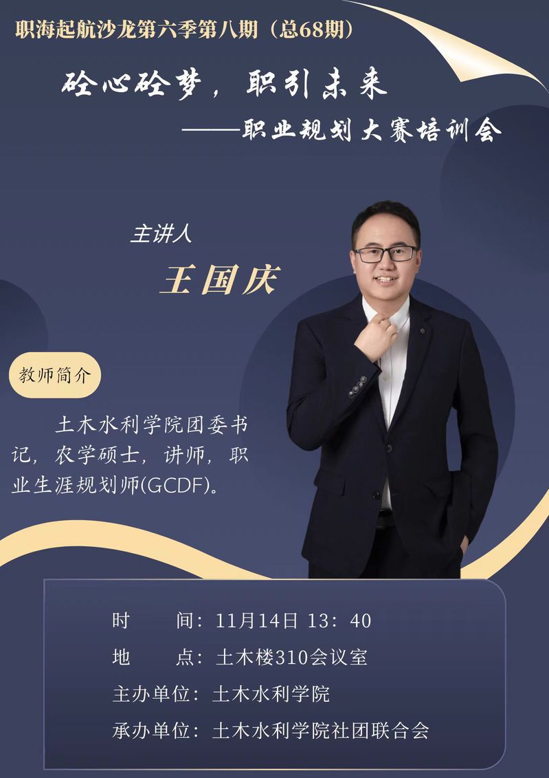 为切实做好大学生职业规划大赛备赛准备,提高学生职业生涯规划意识与求职能力,引导青年学子科学规划职业生涯,金沙集团1862cc成色于2024年11月14日在土木楼301会议室举办职海起航沙龙第六季第八期职业生涯规划大赛选手培训会,学院团委书记王国庆主讲,学院推荐的6名校赛选手参会。