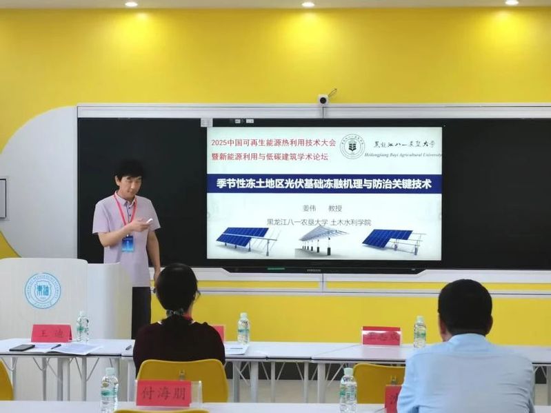 论坛期间,姜伟教授作为“分论坛七:低碳建筑中的清洁能源利用与防灾减灾”的主持人,并作题为《季节性冻土地区光伏冻融机理与防治关键技术》的学术报告,展示了姜老师团队在光伏系统结构工程领域的研究成果和未来科研计划。田晓珂老师作题为《严寒地区土壤储热体长周期储放热特性研究》的学术报告,汇报了在跨季节储热领域的研究成果与技术进展。两位老师在专题研讨环节与多位领域专家进行了深入交流,围绕新能源系统结构工程、地热能利用等热点议题展开探讨,进一步拓展了合作与研究思路。
